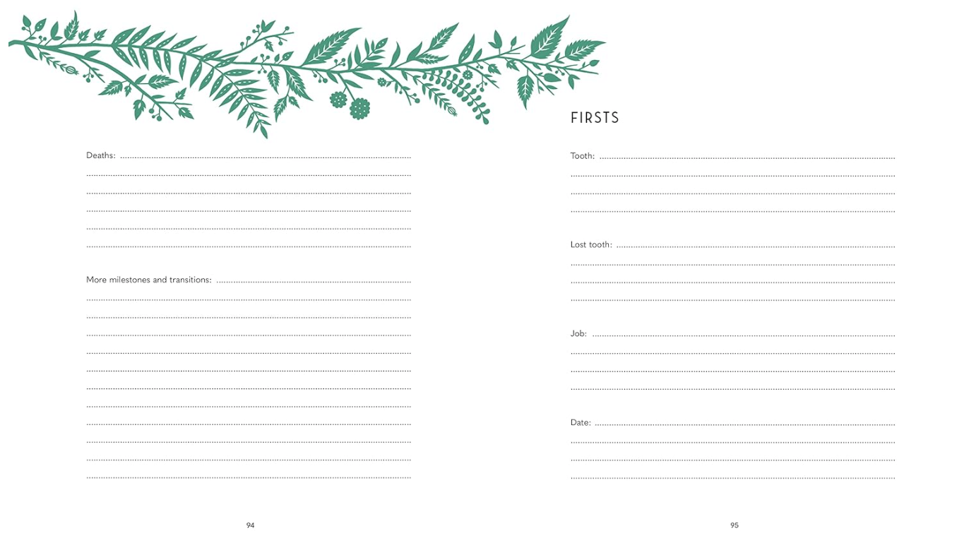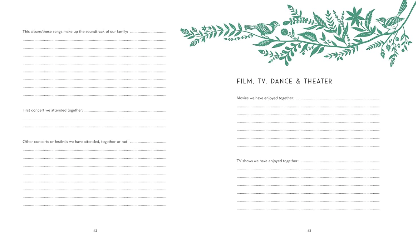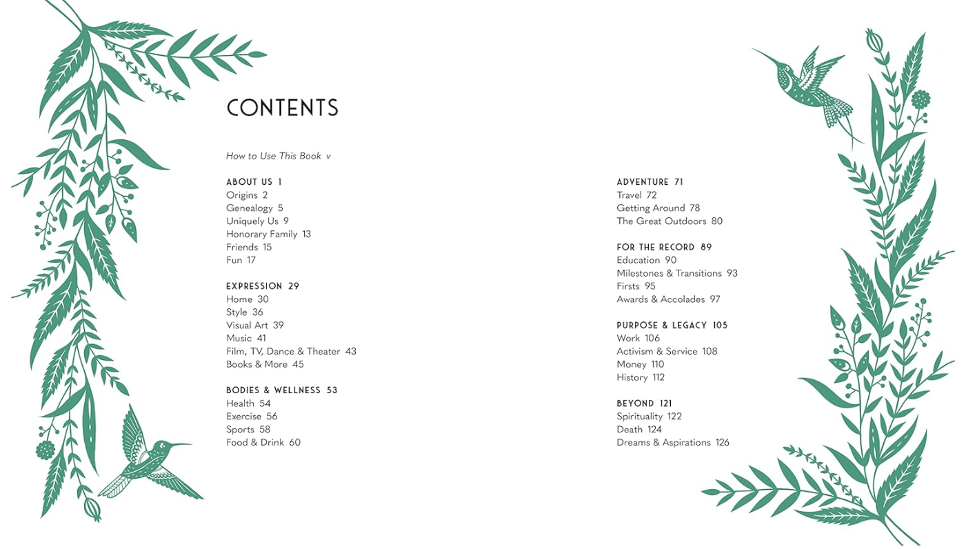 • Family origins • Travel • Pets • Honorary Family • Home • Books • Movies • Songs • Milestones • Work • Education • Fun! • Dreams & Aspirations